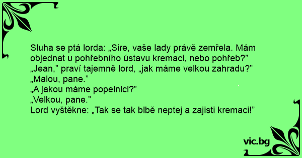 Sluha se ptá lorda: „Sire, vaše lady právě zemřela. Mám objednat u pohřebního ústavu kremaci, nebo pohřeb?”