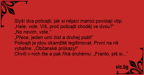 Slyší dva policajti, jak si nějací maníci povídají vtip: „Hele, vole. Víš, proč policajti choděj ve dvou?”