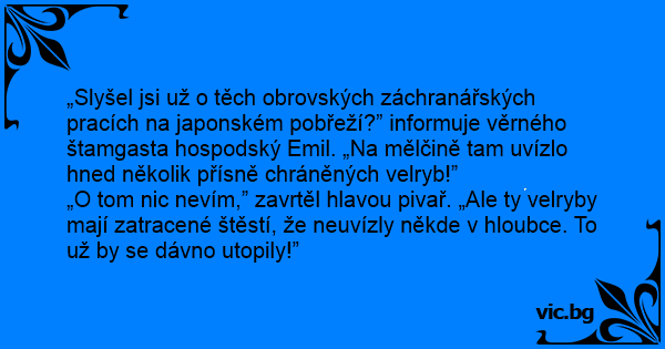 „O tom nic nevím,” zavrtěl hlavou pivař. „Ale ty velryby mají zatracené štěstí, že neuvízly někde v hloubce. To už by se dávno utopily!”