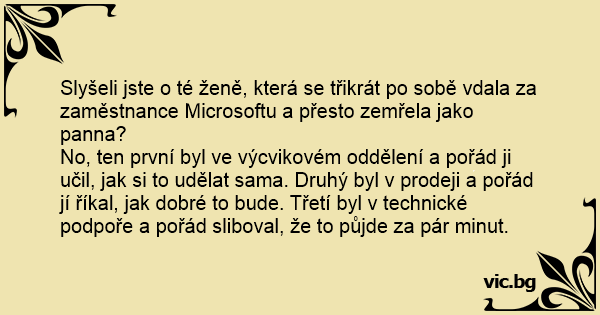 No, ten první byl ve výcvikovém oddělení a pořád ji učil, jak si to udělat sama. Druhý byl v prodeji a pořád jí říkal, jak dobré to bude. Třetí byl v technické podpoře a pořád sliboval, že to půjde za pár minut.