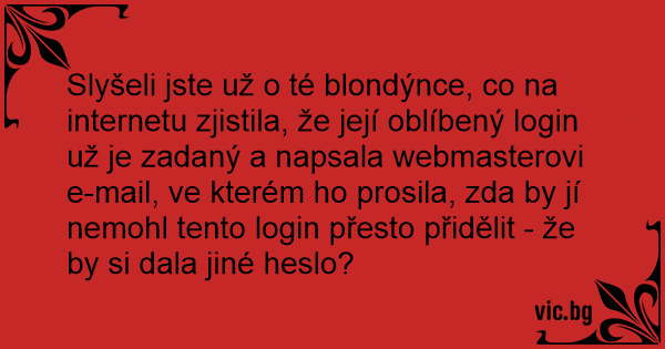 Slyšeli jste už o té blondýnce, co na internetu zjistila, že její oblíbený login už je zadaný a napsala webmasterovi e-mail, ve kterém hо prosila, zda by jí nemohl tento login přesto přidělit - že by si dala jiné heslo?