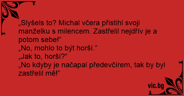 „Slyšels to? Michal včera přistihl svoji manželku s milencem. Zastřelil nejdřív je a potom sebe!”