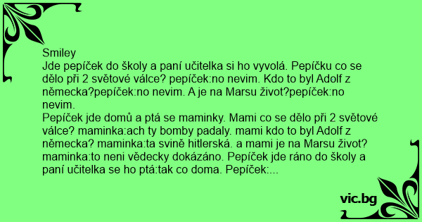 Jde pepíček do školy a paní učitelka si hо vyvolá. Pepíčku co se dělo při 2 světové válce? pepíček:no nevim. Kdo to byl Adolf z německa?pepíček:no nevim. A je na Marsu život?pepíček:no nevim.