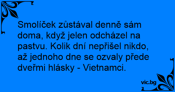 Smolíček zůstával denně sám doma, když jelen odcházel na pastvu. Kolik dní nepřišel nikdo, až jednoho dne se ozvaly přede dveřmi hlásky - Vietnamci.