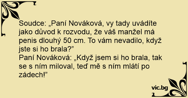 Soudce: „Paní Nováková, vy tady uvádíte jako důvod k rozvodu, že váš manžel má реnis dlouhý 50 cm. To vám nevadilo, když jste si hо brala?”