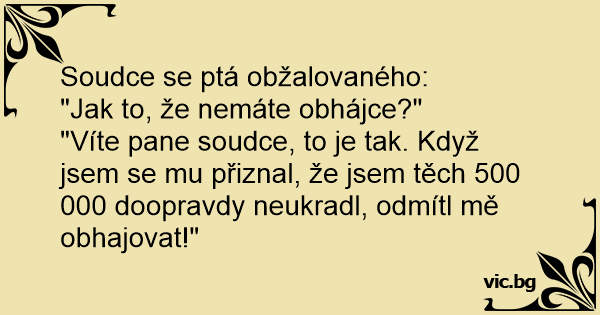 "Víte pane soudce, to je tak. Když jsem se mu přiznal, že jsem těch 500 000 doopravdy neukradl, odmítl mě obhajovat!"
