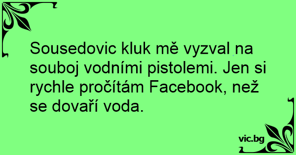 Sousedovic kluk mě vyzval na souboj vodními pistolemi. Jen si rychle pročítám Facebook, než se dovaří voda.