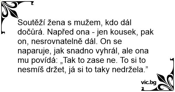 Soutěží žena s mužem, kdo dál dočůrá. Napřed ona - jen kousek, pak on, nesrovnatelně dál. On se naparuje, jak snadno vyhrál, ale ona mu povídá: „Tak to zase ne. To si to nesmíš držet, já si to taky nedržela.”