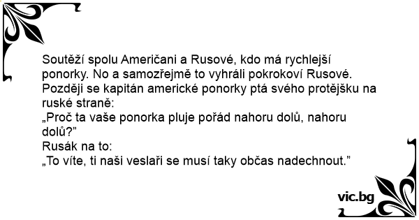 Soutěží spolu Američani a Rusové, kdo má rychlejší ponorky. No a samozřejmě to vyhráli pokrokoví Rusové. Později se kapitán americké ponorky ptá svého protějšku na ruské straně: