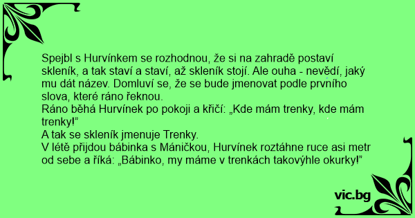 V létě přijdou bábinka s Máničkou, Hurvínek roztáhne ruce asi metr od sebe a říká: „Bábinko, my máme v trenkách takovýhle okurky!”