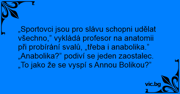 „Sportovci jsou pro slávu schopni udělat všechno,” vykládá profesor na anatomii při probírání svalů, „třeba i anabolika.”<br />„Anabolika?” podiví se jeden zaostalec. „To jako že se vyspí s Annou Bolikou?”