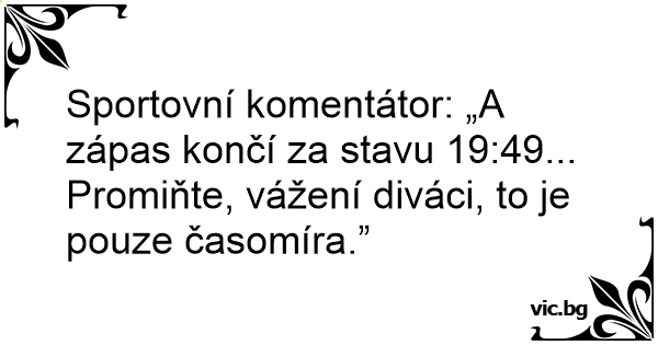 Sportovní komentátor: „A zápas končí za stavu 19:49... Promiňte, vážení diváci, to je pouze časomíra.”