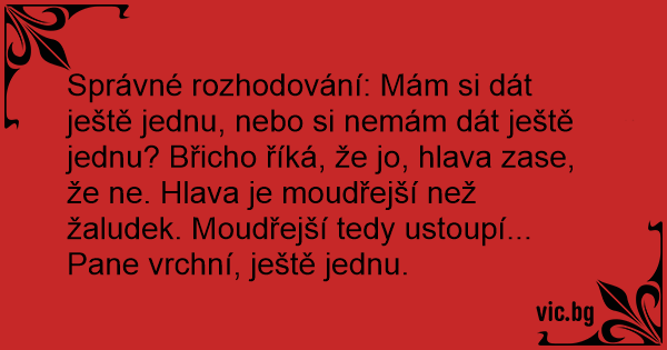 Správné rozhodování: Mám si dát ještě jednu, nebo si nemám dát ještě jednu? Břicho říká, že jo, hlava zase, že ne. Hlava je moudřejší než žaludek. Moudřejší tedy ustoupí... Pane vrchní, ještě jednu.