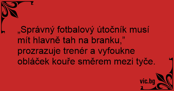 „Správný fotbalový útočník musí mít hlavně tah na branku,” prozrazuje trenér a vyfoukne obláček kouře směrem mezi tyče.