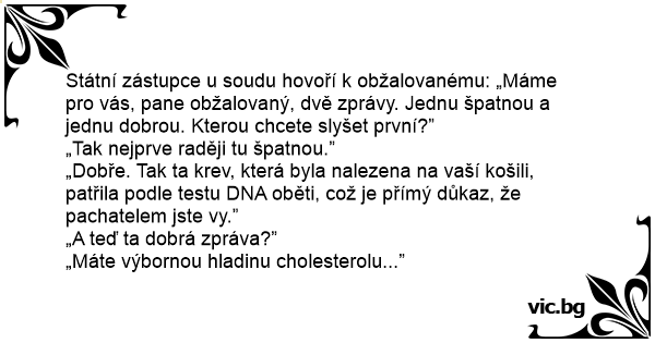 Adwokat do klienta: - Mam dla Pana dobrą i złą wiadomość. Analiza DNA wykazała, że na miejscu zbrodni znaleziono Pańską krew. - To źl A ta dobra wiadomość? - Cholesterol i cukier w normie.