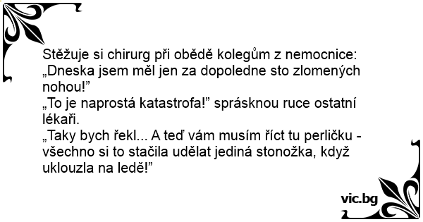 Stěžuje si chirurg při obědě kolegům z nemocnice: „Dneska jsem měl jen za dopoledne sto zlomených nohou!”