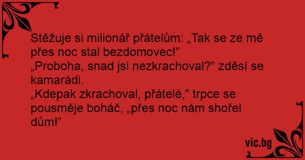 „Kdepak zkrachoval, přátelé,” trpce se pousměje boháč, „přes noc nám shořel dům!”