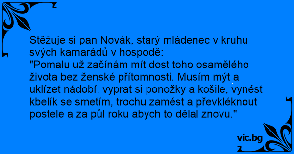 Stěžuje si pan Novák, starý mládenec v kruhu svých kamarádů v hospodě: