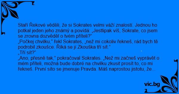„Ano, přesně tak,” pokračoval Sokrates. „Než mi začneš vyprávět o mém příteli, možná bude dobré na chvilku zkusit prosít to, co mi řekneš. První síto se jmenuje Pravda. Máš naprostou jistotu, že to, co mi chceš říct, je pravda?”