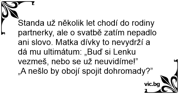 Standa už několik let chodí do rodiny partnerky, ale o svatbě zatím nepadlo ani slovo. Matka dívky to nevydrží a dá mu ultimátum: „Buď si Lenku vezmeš, nebo se už neuvidíme!”