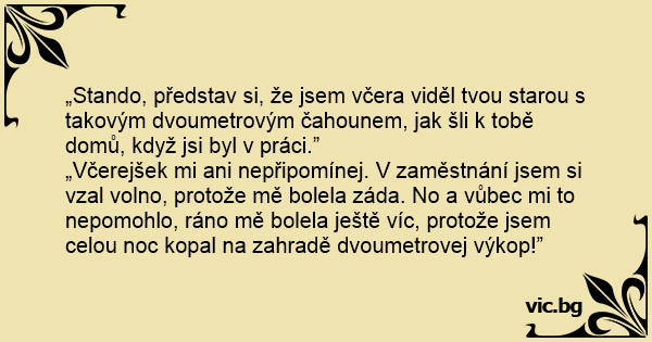 „Včerejšek mi ani nepřipomínej. V zaměstnání jsem si vzal volno, protože mě bolela záda. No a vůbec mi to nepomohlo, ráno mě bolela ještě víc, protože jsem celou noc kopal na zahradě dvoumetrovej výkop!”