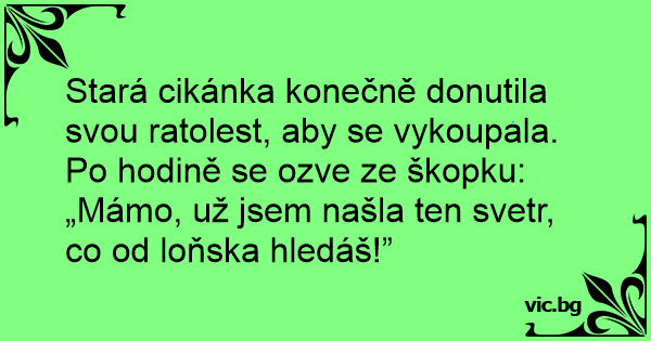 Stará cikánka konečně donutila svou ratolest, aby se vykoupala. Po hodině se ozve ze škopku: „Mámo, už jsem našla ten svetr, co od loňska hledáš!”
