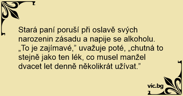 „To je zajímavé,” uvažuje poté, „chutná to stejně jako ten lék, co musel manžel dvacet let denně několikrát užívat.”