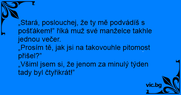 „Stará, poslouchej, že ty mě podvádíš s pošťákem!” říká muž své manželce takhle jednou večer.