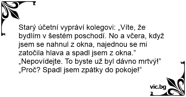 Starý účetní vypráví kolegovi: „Víte, že bydlím v šestém poschodí. No a včera, když jsem se nahnul z okna, najednou se mi zatočila hlava a spadl jsem z okna.”