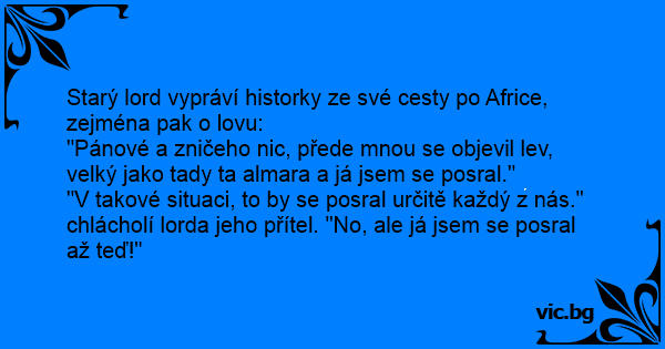 "Pánové a zničeho nic, přede mnou se objevil lev, velký jako tady ta almara a já jsem se posral."