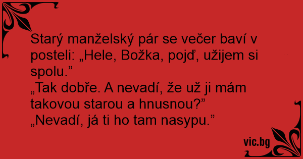 Starý manželský pár se večer baví v posteli: „Hele, Božka, pojď, užijem si spolu.”