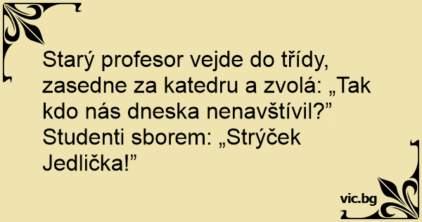 Starý profesor vejde do třídy, zasedne za katedru a zvolá: „Tak kdo nás dneska nenavštívil?”