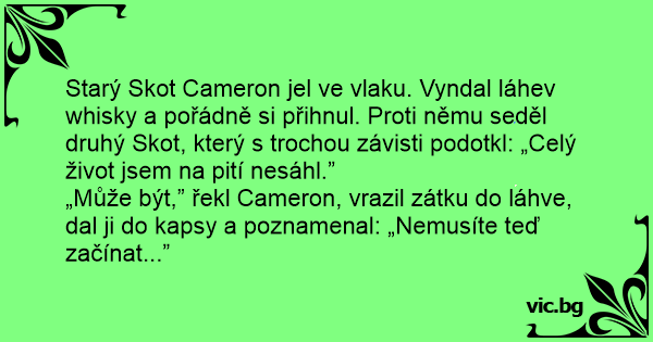 Starý Skot Cameron jel ve vlaku. Vyndal láhev whisky a pořádně si přihnul. Proti němu seděl druhý Skot, který s trochou závisti podotkl: „Celý život jsem na pití nesáhl.”