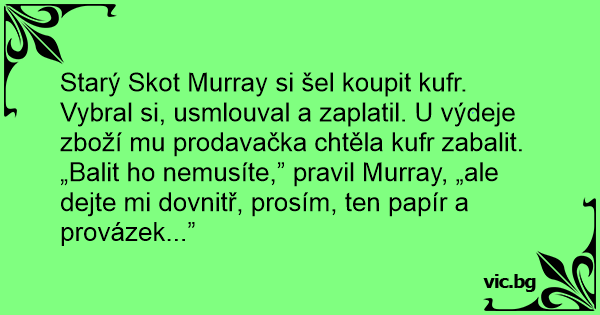 Starý Skot Murray si šel koupit kufr. Vybral si, usmlouval a zaplatil. U výdeje zboží mu prodavačka chtěla kufr zabalit.