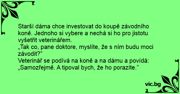 Veterinář se podívá na koně a na dámu a povídá: „Samozřejmě. A tipoval bych, že hо porazíte.”