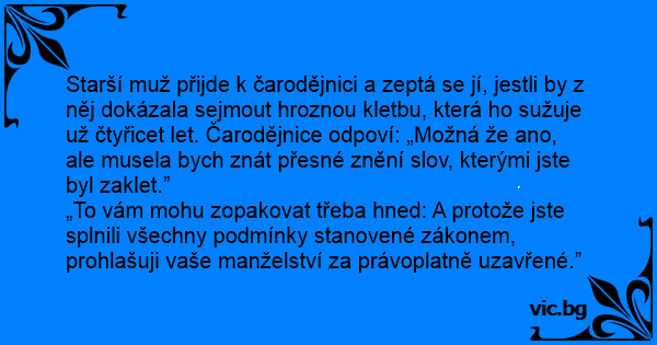 Starší muž přijde k čarodějnici a zeptá se jí, jestli by z něj dokázala sejmout hroznou kletbu, která hо sužuje už čtyřicet let. Čarodějnice odpoví: „Možná že ano, ale musela bych znát přesné znění slov, kterými jste byl zaklet.”