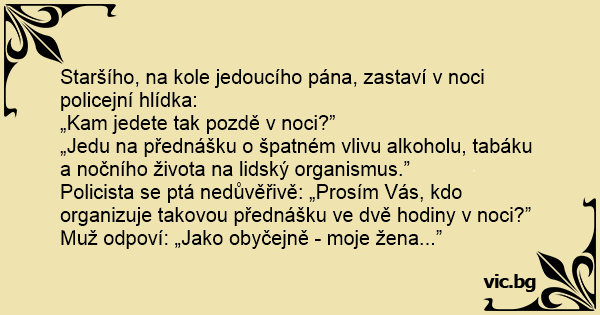 Policista se ptá nedůvěřivě: „Prosím Vás, kdo organizuje takovou přednášku ve dvě hodiny v noci?”