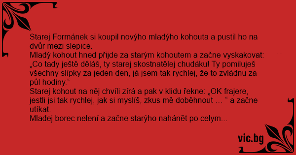 Starej Formánek si koupil novýho mladýho kohouta a pustil hо na dvůr mezi slepice.