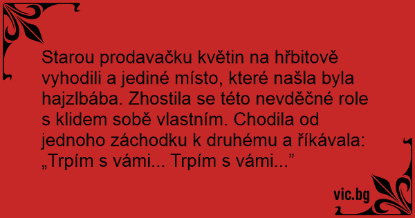 Starou prodavačku květin na hřbitově vyhodili a jediné místo, které našla byla hajzlbába. Zhostila se této nevděčné role s klidem sobě vlastním. Chodila od jednoho záchodku k druhému a říkávala: „Trpím s vámi... Trpím s vámi...”