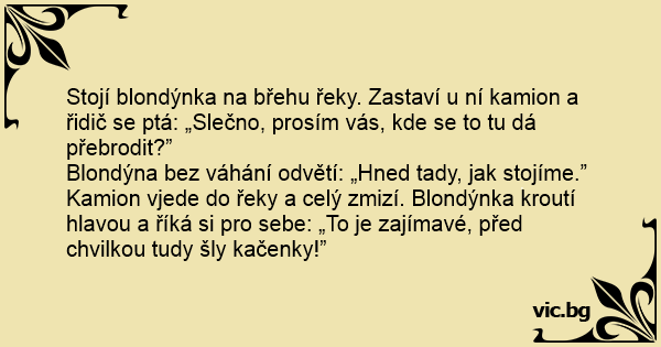 Stojí blondýnka na břehu řeky. Zastaví u ní kamion a řidič se ptá: „Slečno, prosím vás, kde se to tu dá přebrodit?”
