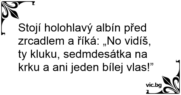 Stojí holohlavý albín před zrcadlem a říká: „No vidíš, ty kluku, sedmdesátka na krku a ani jeden bílej vlas!”