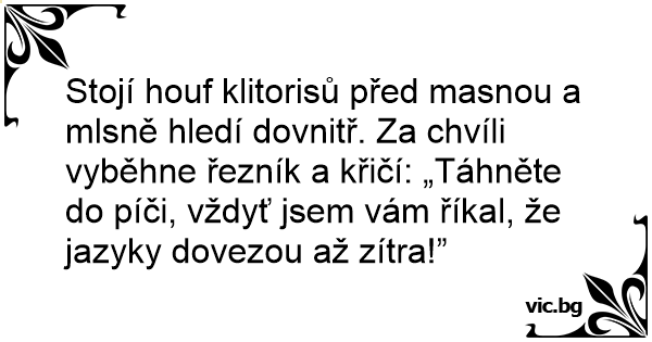Stojí houf klitorisů před masnou a mlsně hledí dovnitř. Za chvíli vyběhne řezník a křičí: „Táhněte do píči, vždyť jsem vám říkal, že jazyky dovezou až zítra!”