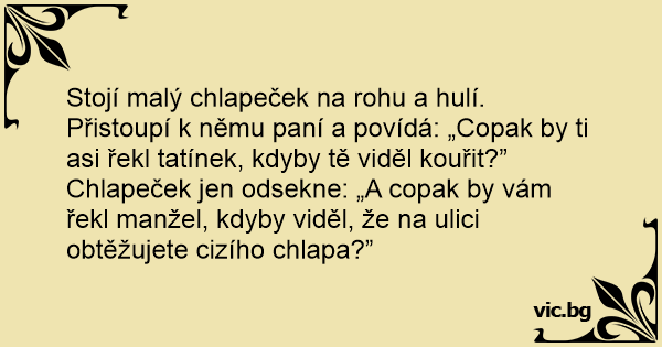 Stojí malý chlapeček na rohu a hulí. Přistoupí k němu paní a povídá: „Copak by ti asi řekl tatínek, kdyby tě viděl kouřit?”