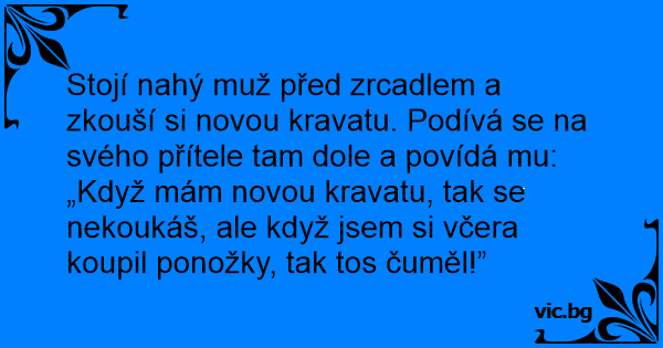Stojí nahý muž před zrcadlem a zkouší si novou kravatu. Podívá se na svého přítele tam dole a povídá mu: „Když mám novou kravatu, tak se nekoukáš, ale když jsem si včera koupil ponožky, tak tos čuměl!”