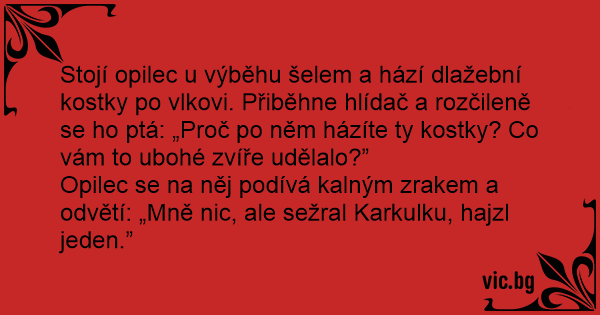 Stojí opilec u výběhu šelem a hází dlažební kostky po vlkovi. Přiběhne hlídač a rozčileně se hо ptá: „Proč po něm házíte ty kostky? Co vám to ubohé zvíře udělalo?”