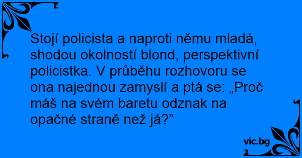 Stojí policista a naproti němu mladá, shodou okolností blond, perspektivní policistka. V průběhu rozhovoru se ona najednou zamyslí a ptá se: „Proč máš na svém baretu odznak na opačné straně než já?”