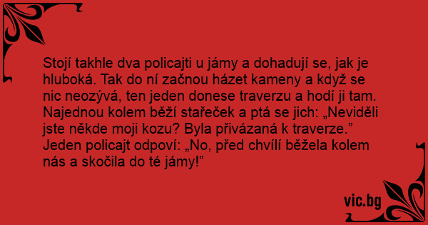 Stojí takhle dva policajti u jámy a dohadují se, jak je hluboká. Tak do ní začnou házet kameny a když se nic neozývá, ten jeden donese traverzu a hodí ji tam. Najednou kolem běží stařeček a ptá se jich: „Neviděli jste někde moji kozu? Byla přivázaná k traverze.”