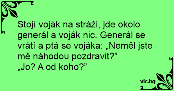 Stojí voják na stráži, jde okolo generál a voják nic. Generál se vrátí a ptá se vojáka: „Neměl jste mě náhodou pozdravit?”