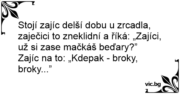 Stojí zajíc delší dobu u zrcadla, zaječici to zneklidní a říká: „Zajíci, už si zase mačkáš beďary?”