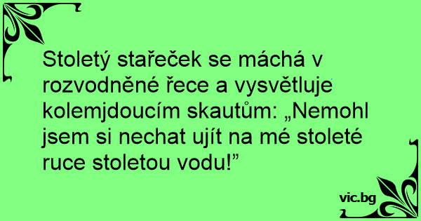 Stoletý stařeček se máchá v rozvodněné řece a vysvětluje kolemjdoucím skautům: „Nemohl jsem si nechat ujít na mé stoleté ruce stoletou vodu!”